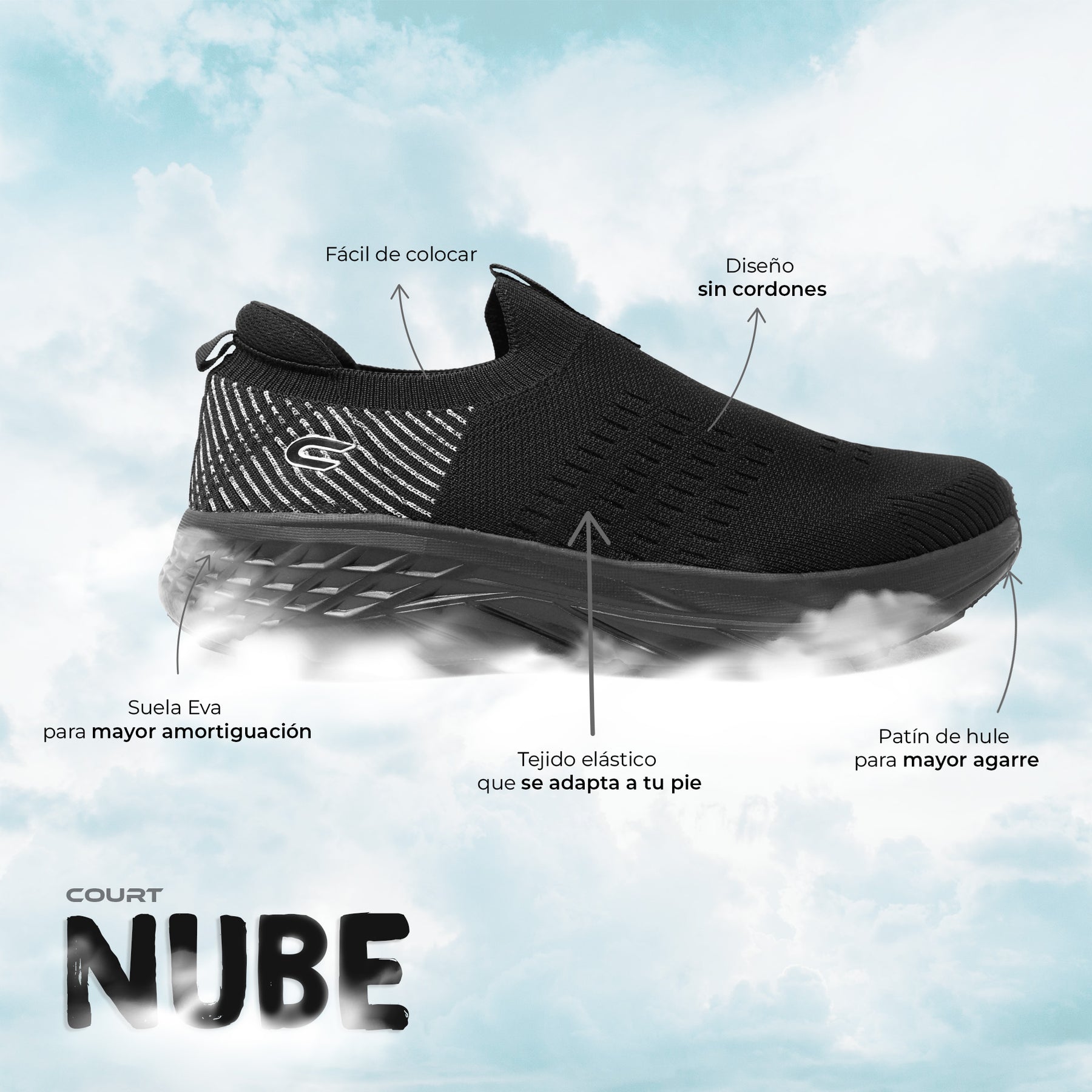 Con un ajuste tipo Slip-On Fit, NUBE se pone en segundos y se adapta a tu pie con una sensación suave y ligera.